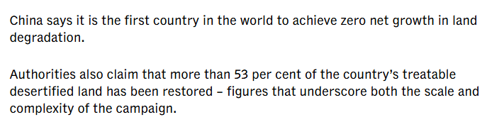 文章说,作为世界上规模最大、持续时间最长的生态恢复计划,“三北”防护林工程创造了多项纪录:中国成为首个实现土地退化零增长的国家,53%的可治理沙化土地得到有效治理。这些数字背后,是中国对生态治理的坚定决心和持续投入。