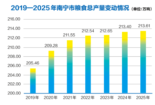 手中有粮,心中不慌。2025年,南宁市粮食生产交出了一份沉甸甸的“成绩单”:粮食总产量达213.6万吨,较上年增加0.2万吨,增长0.1%。这是自2020年以来,南宁市粮食总产量连续六年实现稳定增长。